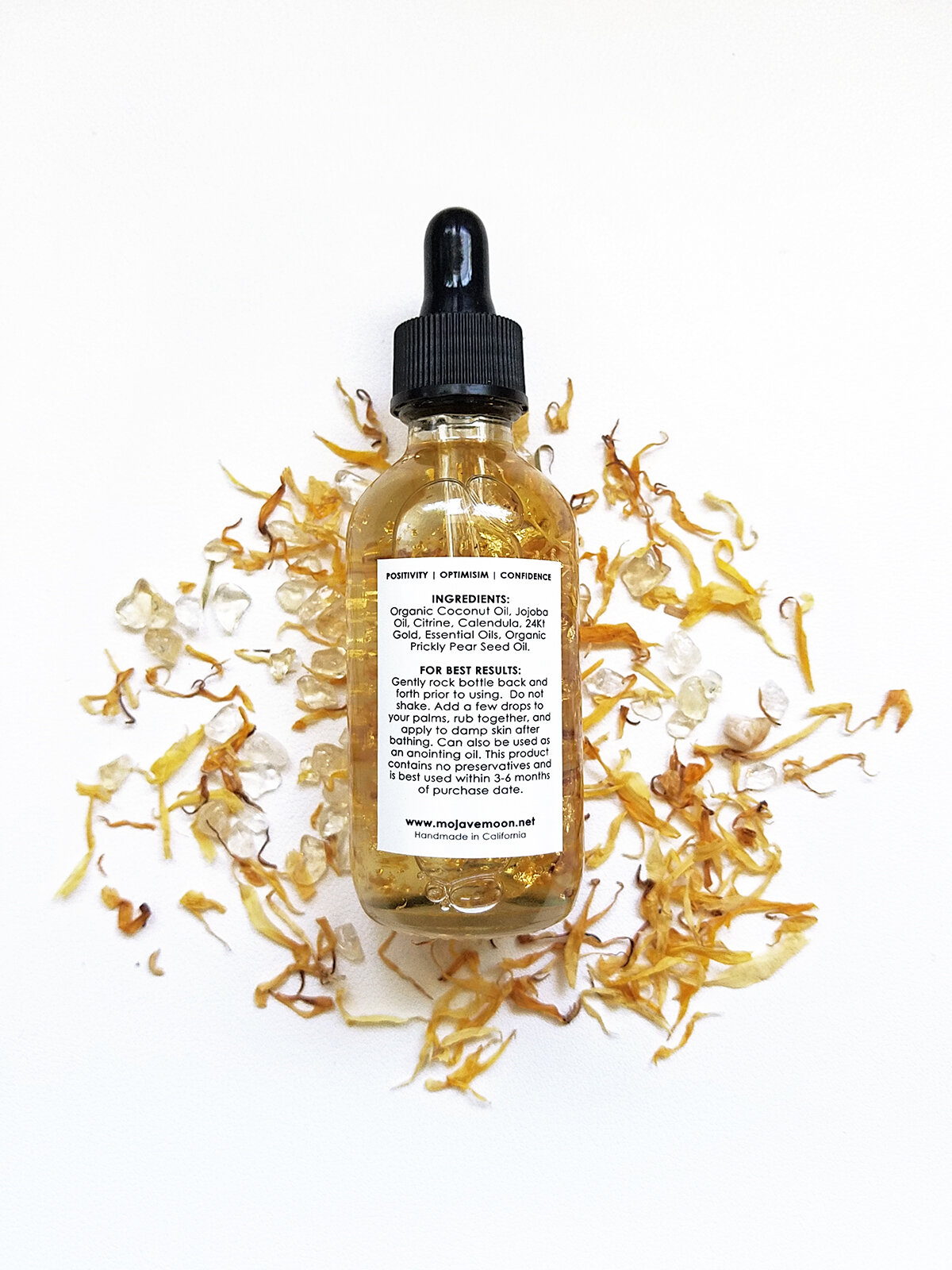 Ingredients: Organic Coconut Oil, Jojoba Oil, Citrine, Calendula Petals, 24Kt Gold, Essential Oils, Organic Prickly Pear Seed Oil.